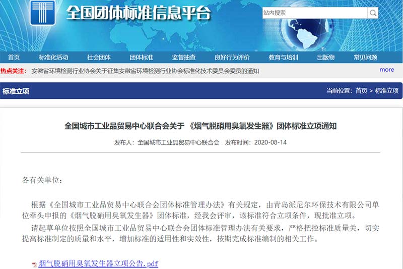 全國(guó)城市工業(yè)品貿(mào)易中心聯(lián)合會(huì)關(guān)于《煙氣脫硝用臭氧發(fā)生器》團(tuán)體標(biāo)準(zhǔn)立項(xiàng)通知